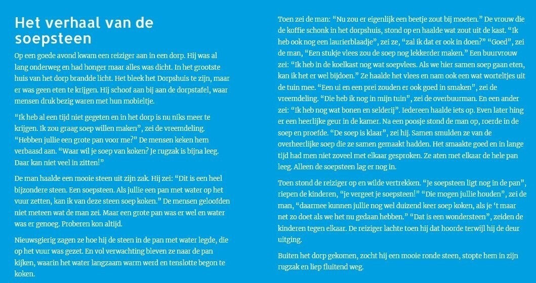 En het soepsteenverhaal hoort bij de dorpssoep. Lees het hieronder of beluister de Belgische versie (klik op de knop):